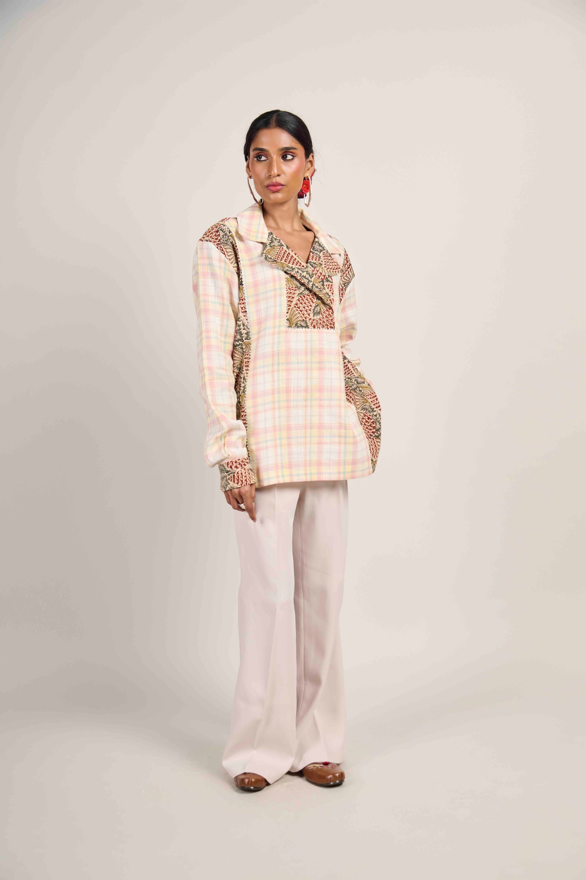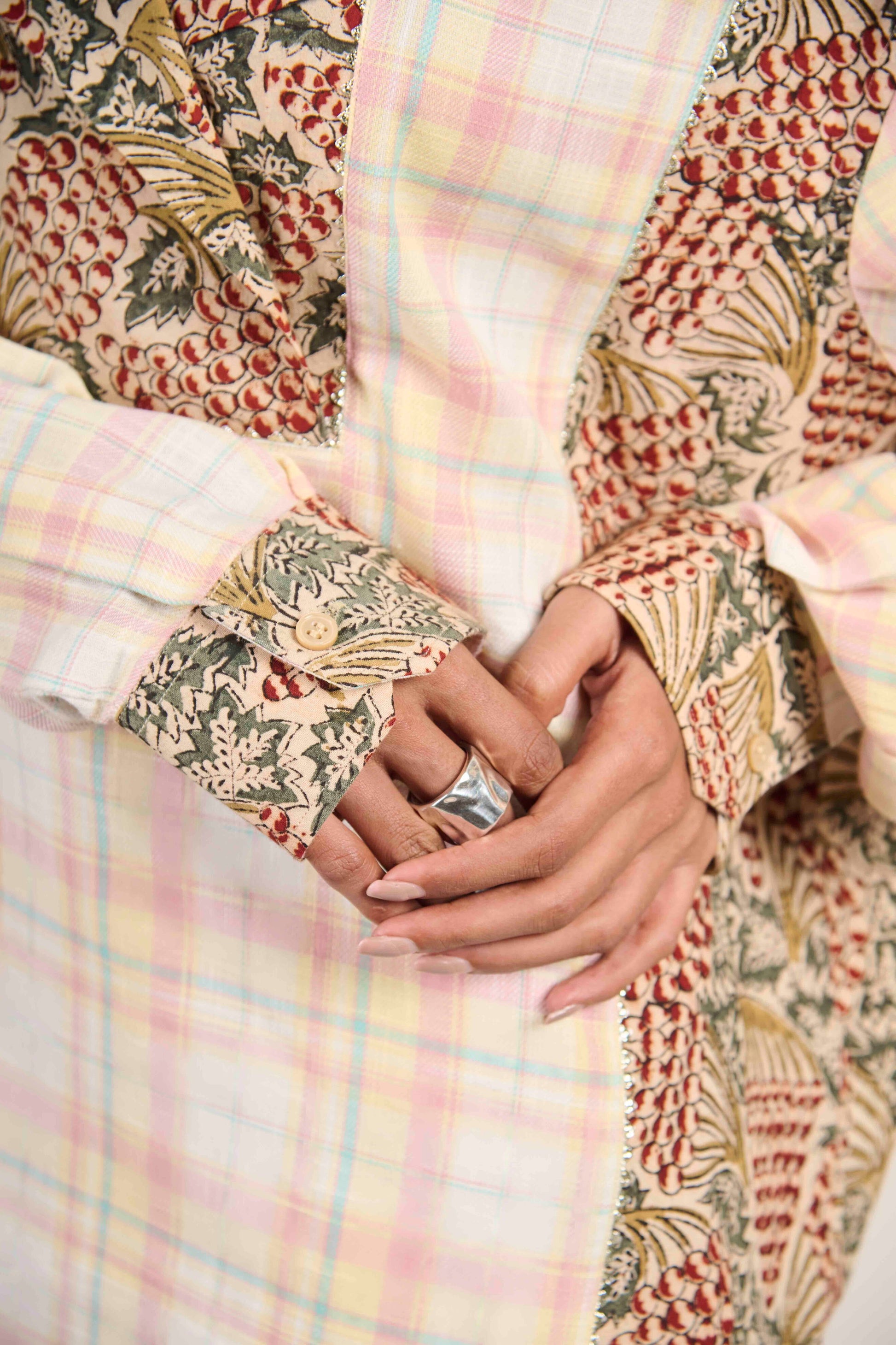 The Open-Collar Grid Shirt brings ease to elegance. Soft pastel checks meet hand-crafted Kalamkari florals, framed by an open-collar silhouette — a light, effortless piece where structure finds its gentle bloom.