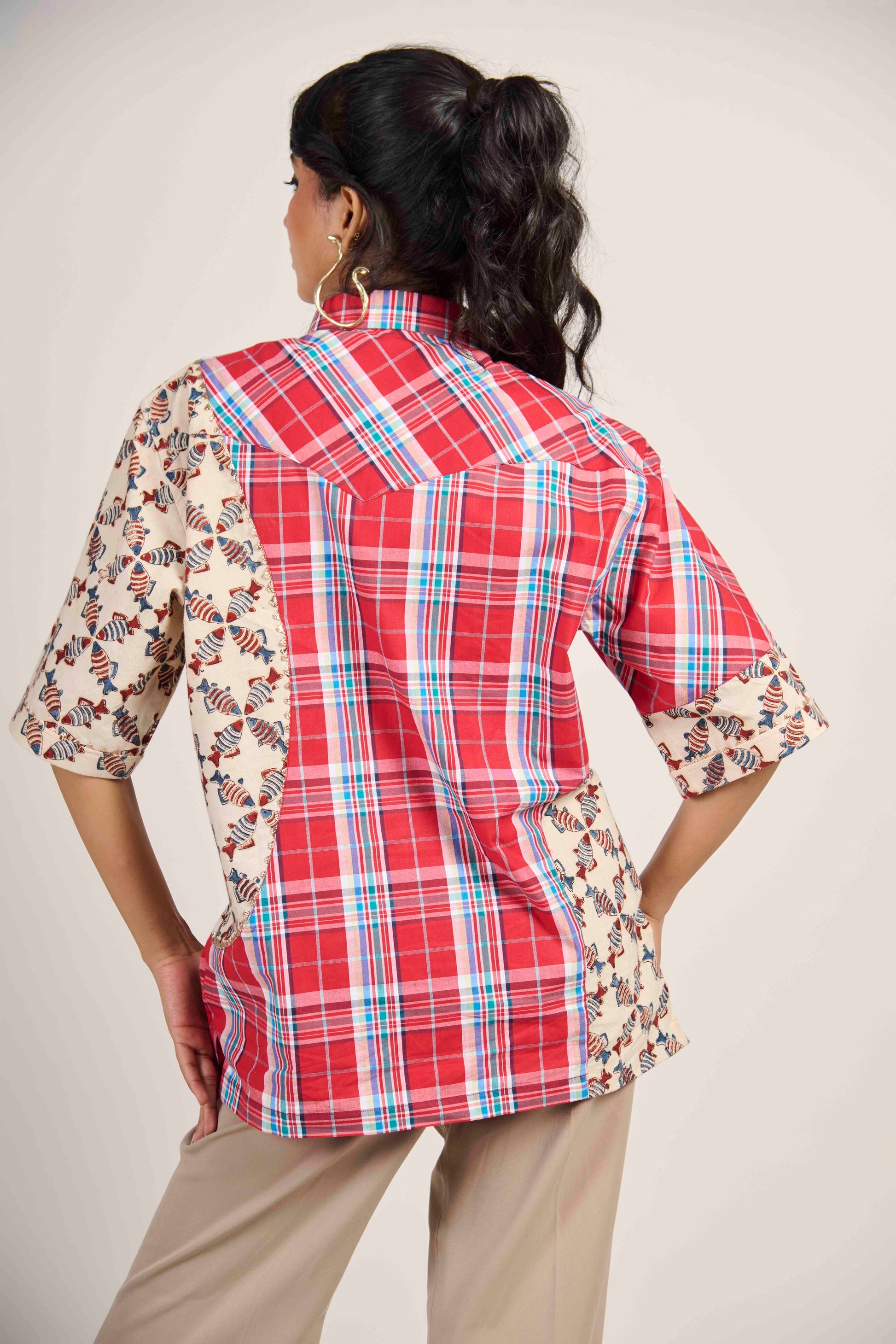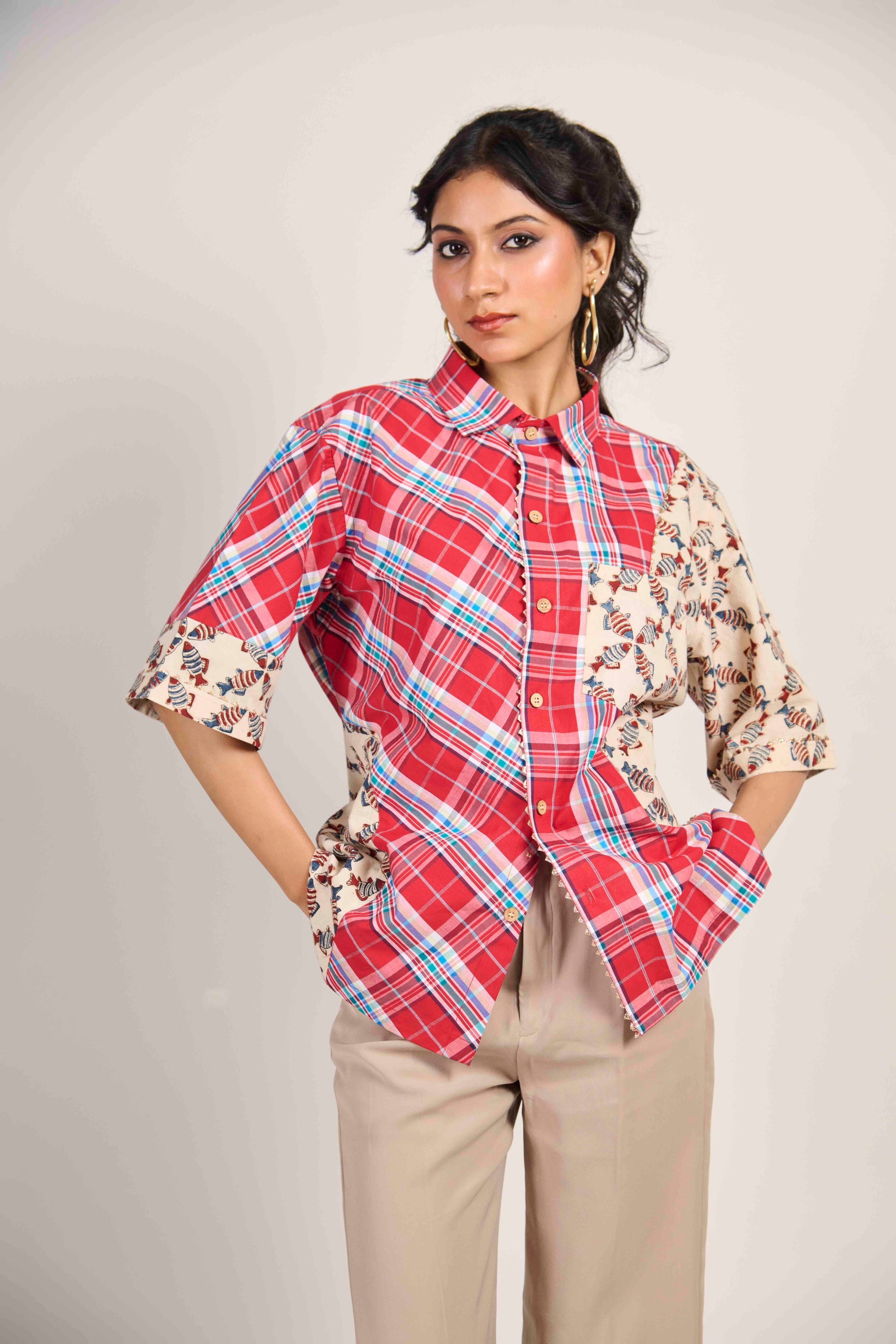 The Crimson Fish Grid Shirt is where playfulness meets precision. Bold red checks flow into hand-done Kalamkari fish motifs — a symbol of movement, creativity, and freedom within the grid.