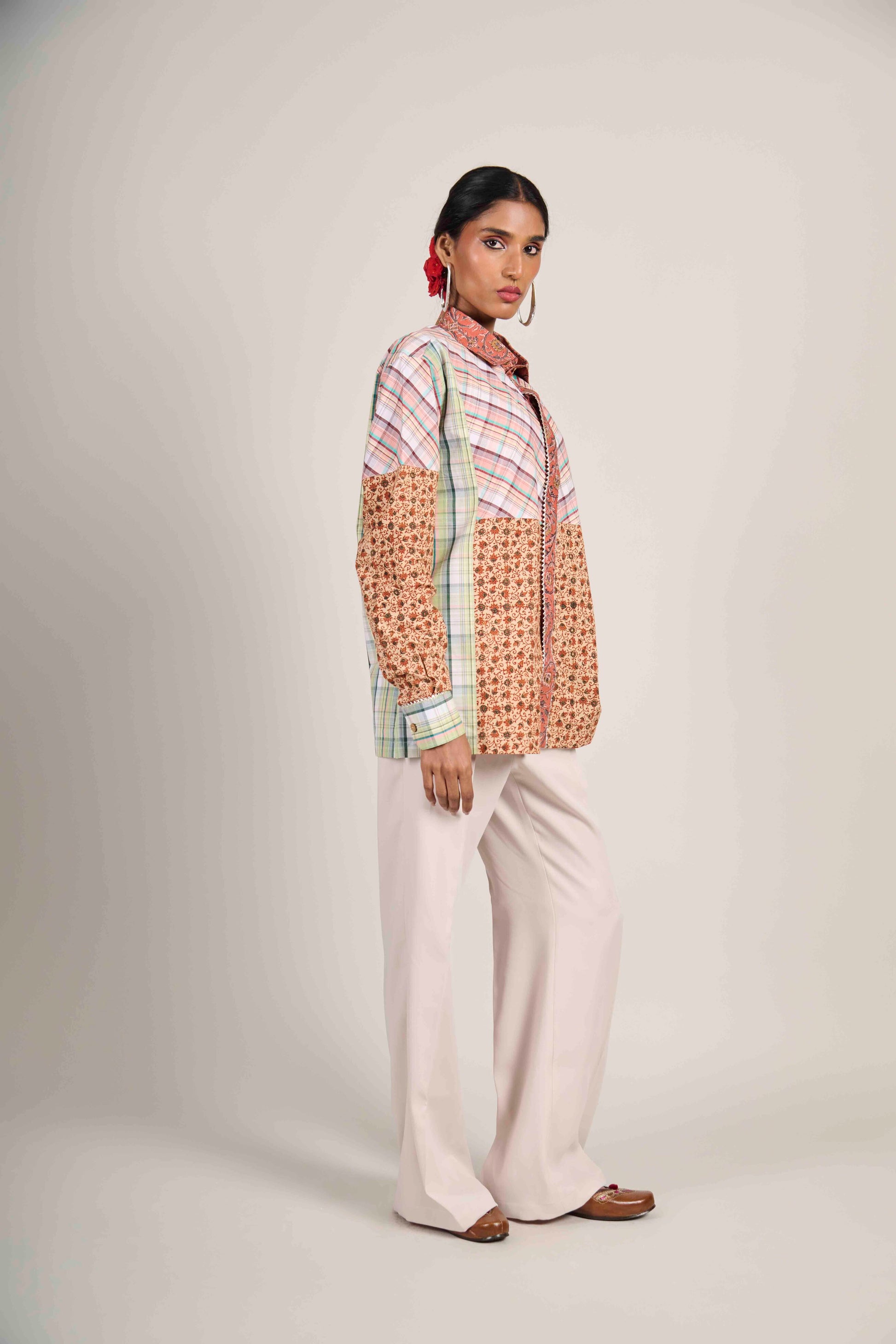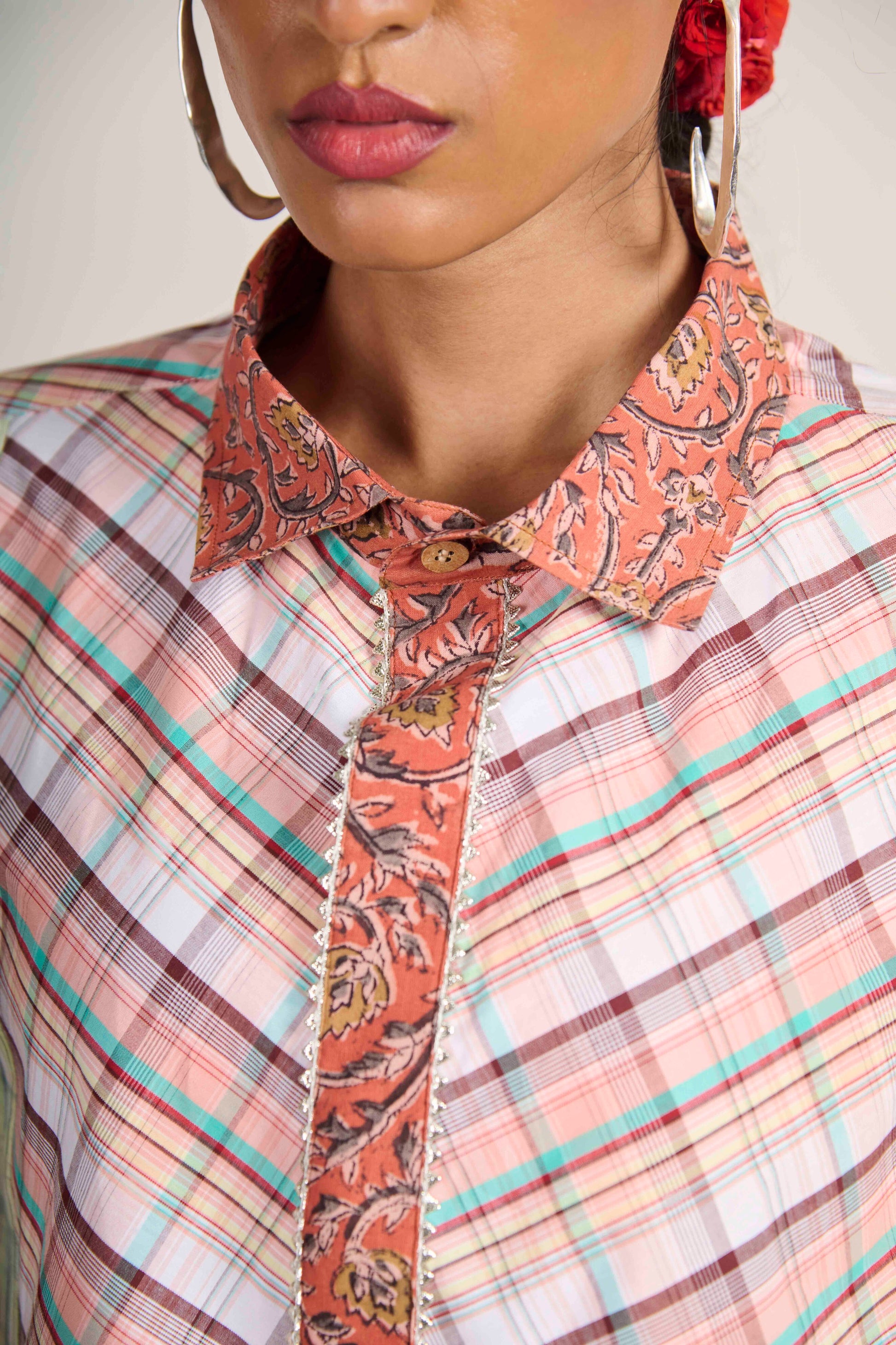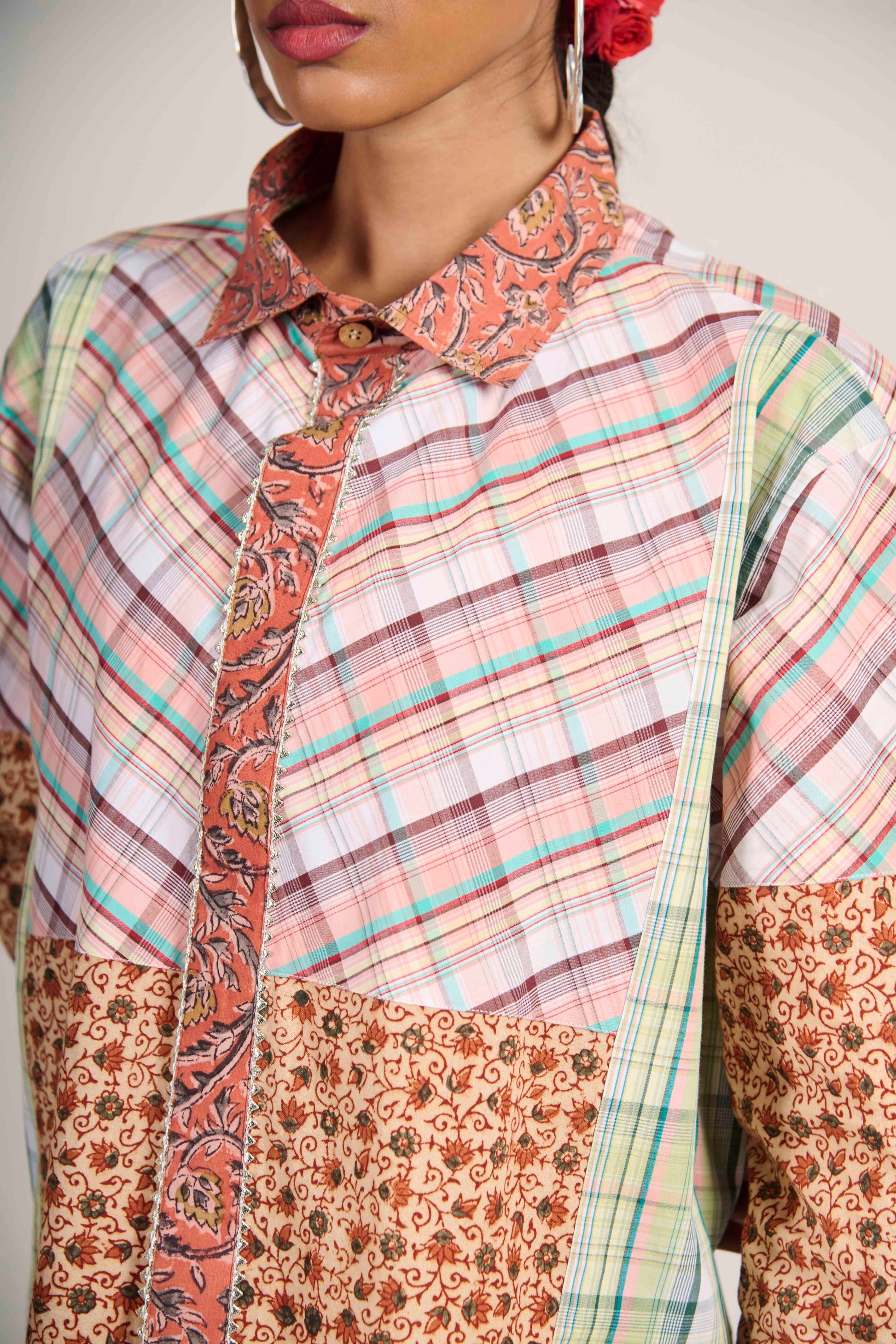 Where warmth meets geometry. The Rusty Earth Matrix Shirt blends rust-toned Kalamkari with pastel checks — a reminder that structure can feel grounded, and craft can feel modern.