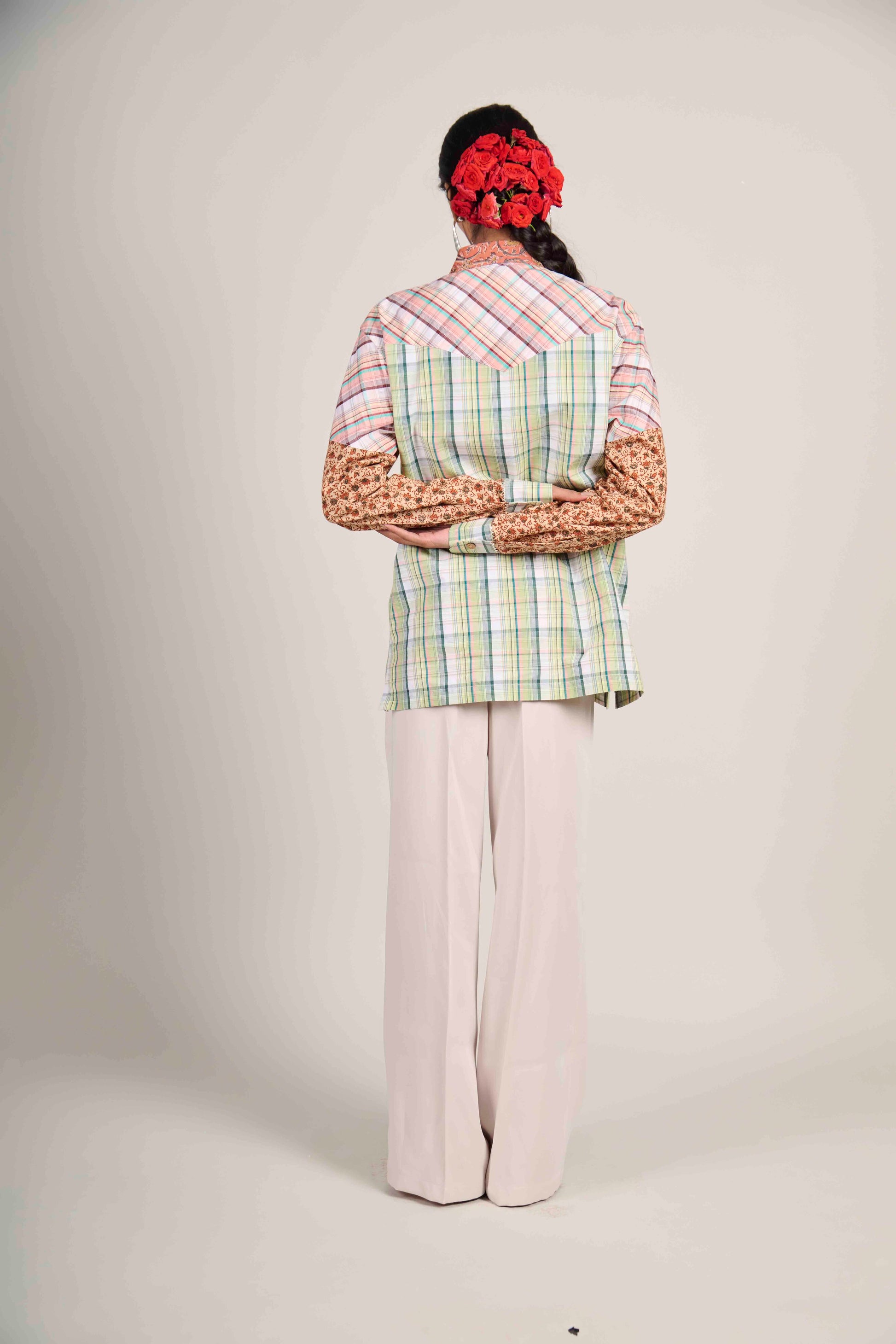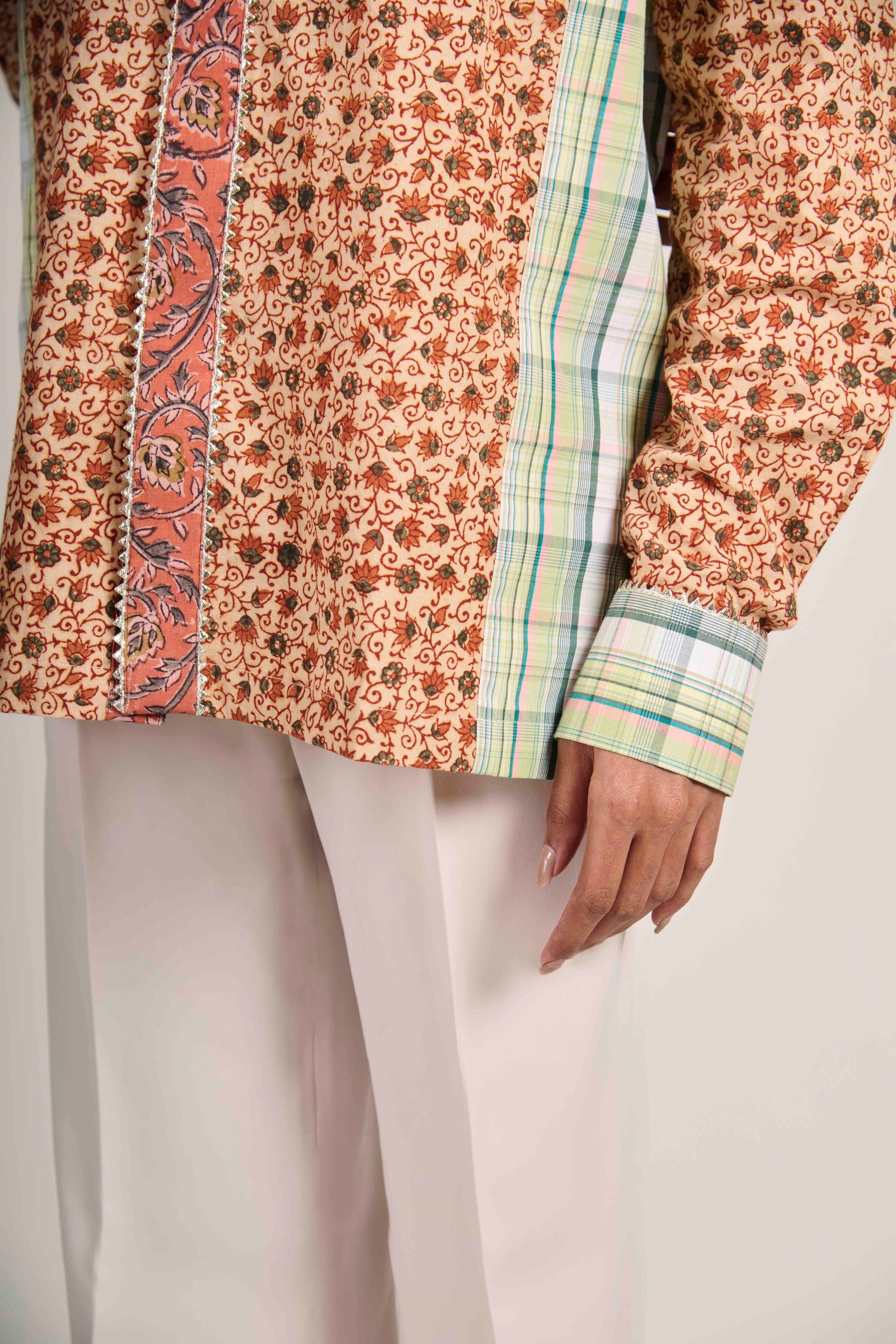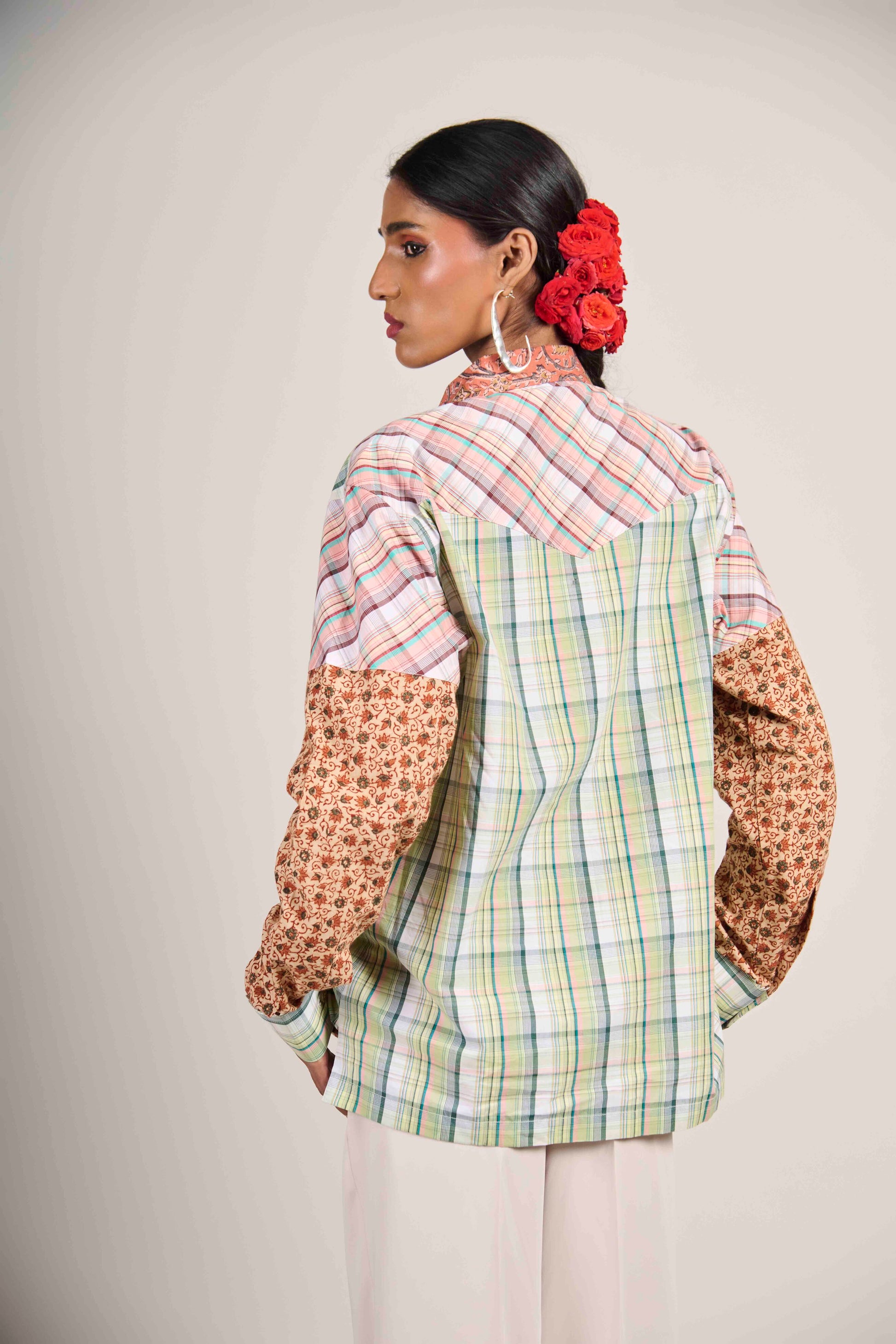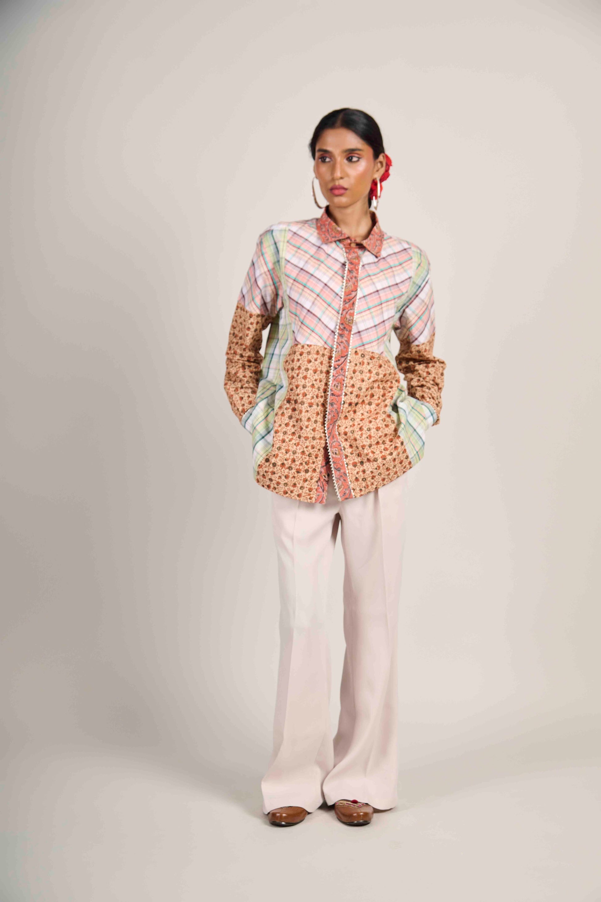 Where warmth meets geometry. The Rusty Earth Matrix Shirt blends rust-toned Kalamkari with pastel checks — a reminder that structure can feel grounded, and craft can feel modern.