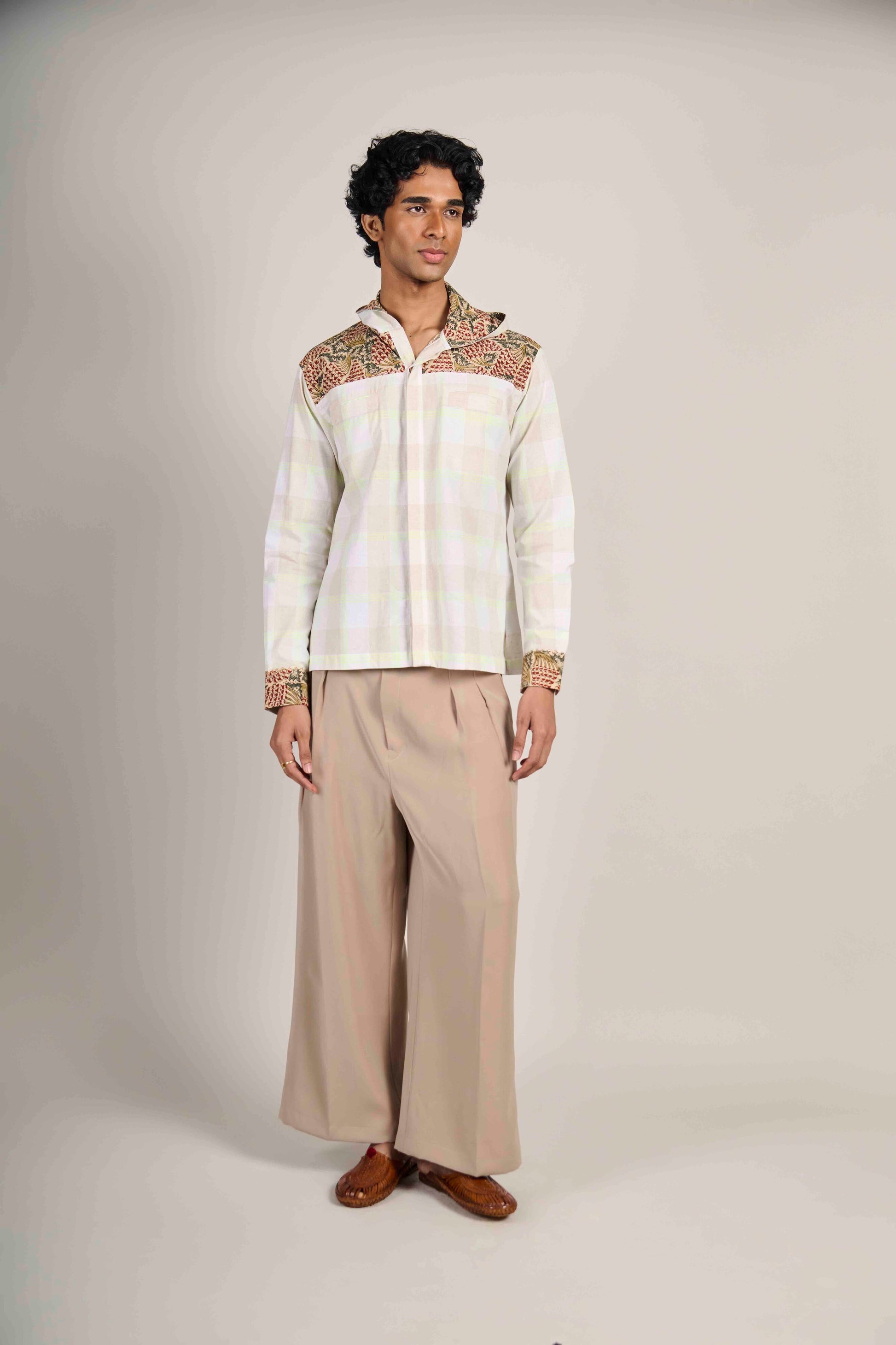 A calm expression in craft. The Sage Grid Kalamkari Hoodie blends airy pastel checks with earthy hand-blocked Kalamkari — where modern silhouettes meet grounded tradition.